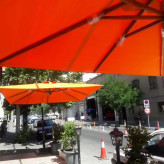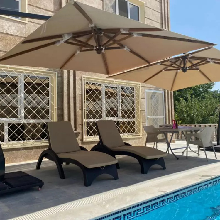 چتر پایه کنار با بدنه آهنی و بازوهای چوبی در رنگهای قرمز سبز زرد نسکافه ای مشکی آبی