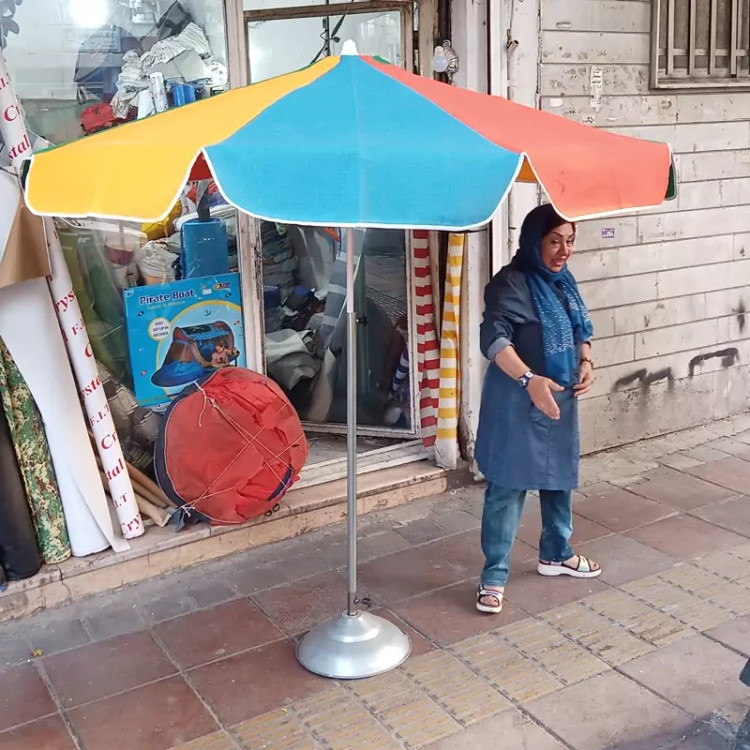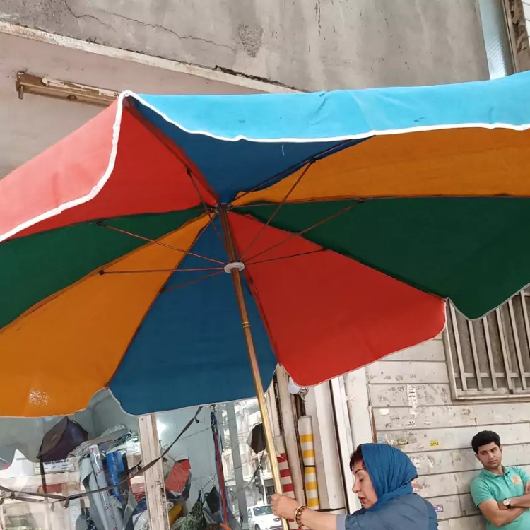 چتر سایبان از جنس برزنت و اسکلت آهنی بسیار محکم و پایه وسط که سایه آن بسیار خنک میباشد