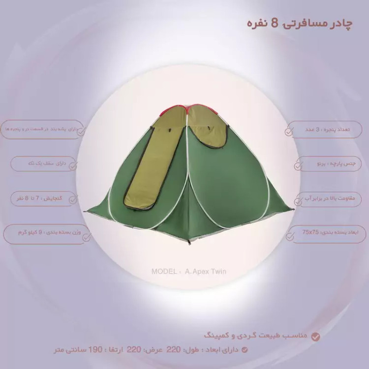 برای مسافرتی مفرح در دامان طبیعت شاید هیچ چیز به اندازهی یک چادر بزرگ و جادار که در شرایط جمع بودن فضای اندکی را اشغال کند و جابجایی آن به سادگی امکان پذیر باشد ضروری به نظر نرسد. چادر مسافرتی 8 نفره این مشخصات را همگی در کنار هم جای داده و به شما عرضه میکند. این چادر در حالت بسته بودن ابعادی معادل 15 × 75 × 75 سانتیمتر را اشغال میکند که به سادگی میتواند در صندوق خودروی شما جایگیرد.چادر مسافرتی 8 نفره آ آپکس سه پنجره دارد و از ستون بندی سبک و مقاوم فایبرگلاس بهره میبرد. بدنهی این چادر در برابر آب باران مقاومت خوبی از خود نشان میدهد و شما را در برابر ریزش باران طبیعت مصون خواهد کرد.ابعاد این چادر برابر است با طول: 220 عرض: 220 ارتفاع: 190 سانتی متر خرید و استفاده از این چادر مناسب برای تمام کسانی است که به سفرهای کمپینگ و شب را در زیر آسمان سپری کردن علاقهمند هستند.