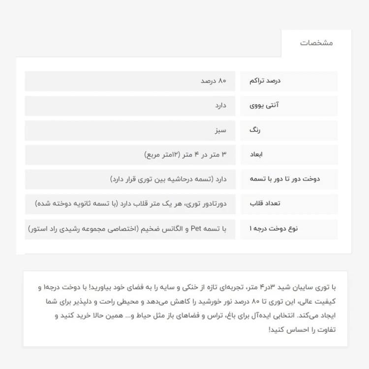 توری شید، 3در4، با 80 درصد تراکم، انتی یووی دار بوده که از اشعه خطرناک خورشید جلوگیری میکند، دوخت درجه 1 (منظور تسمه و دوخت بسیار قویتر میباشد) ، تسمه محکم دور کار و هر متر یک قلاب با تسمه ثانویه دوخت خورده است، مشخصات کامل محصول در تصویر آخر آمده است. این ابعاد اماده و بسته بندی شده هست، زمان تحویل به پست، تیپاکس، یا پیک بسته به زمان ثبت سفارش، بین 1 تا 3 روز میباشد.