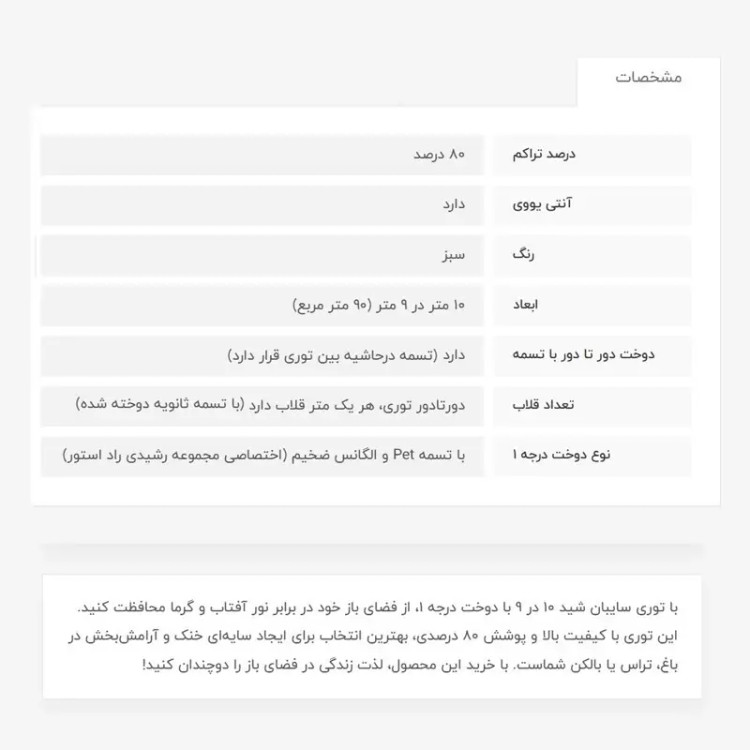توری سایبان شید، 10 در9، دوخت درجه1، 80درصد